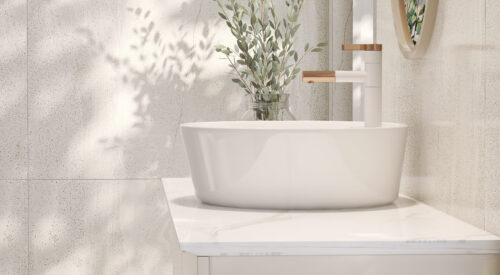 Modern and minimal design of cream colored bathroom vanity with marble counter top and white round ceramic washbasin with vase of houseplant in sunlight from window